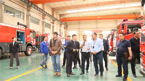 在北京中卓时代消防设备科技有限公司,代表团实地考察了远程供水系统、举高类消防车、机场主力消防车、重型泡沫车、宿营车等消防车辆装备。
